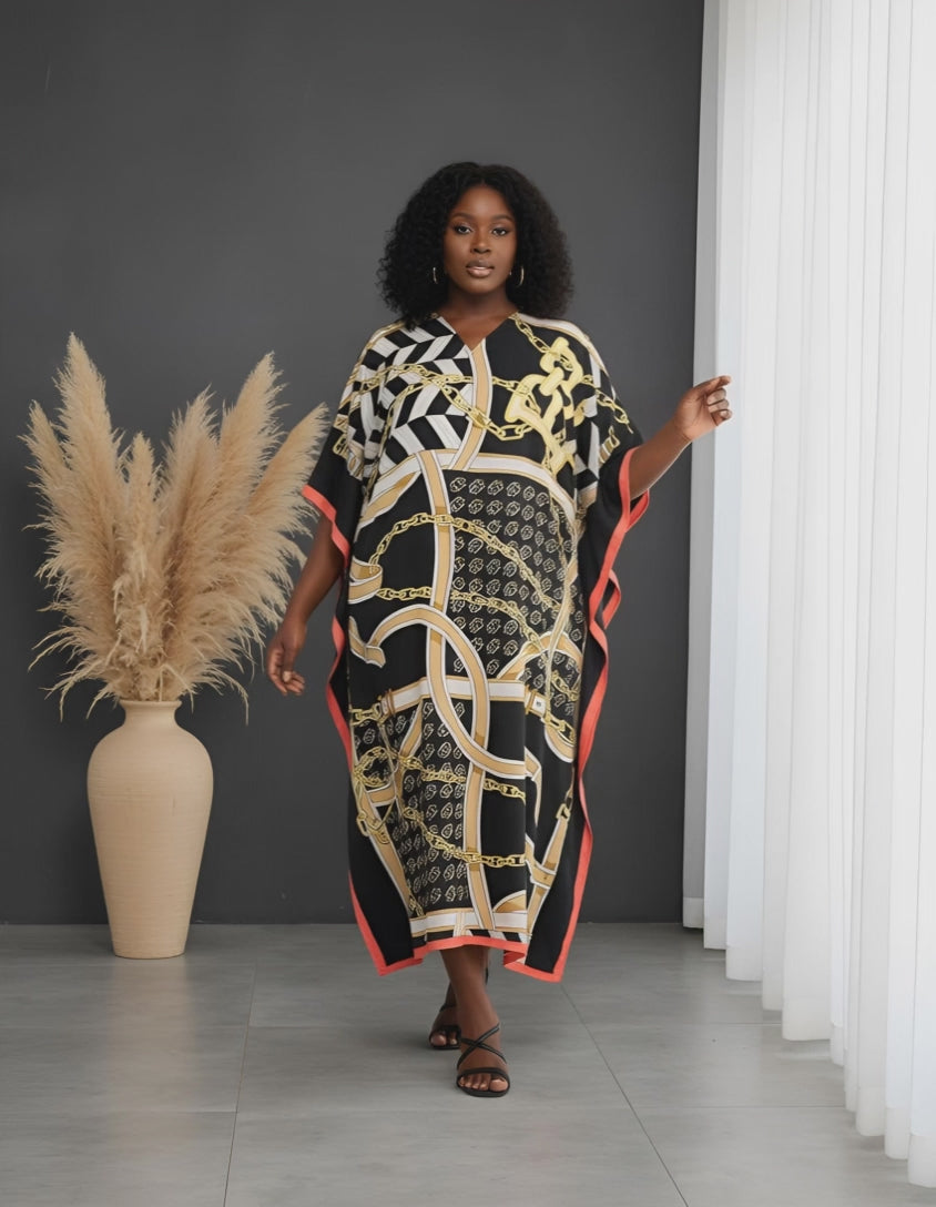 Geometric Orange Satin Silk Plus Size Kaftan Dress for Women
