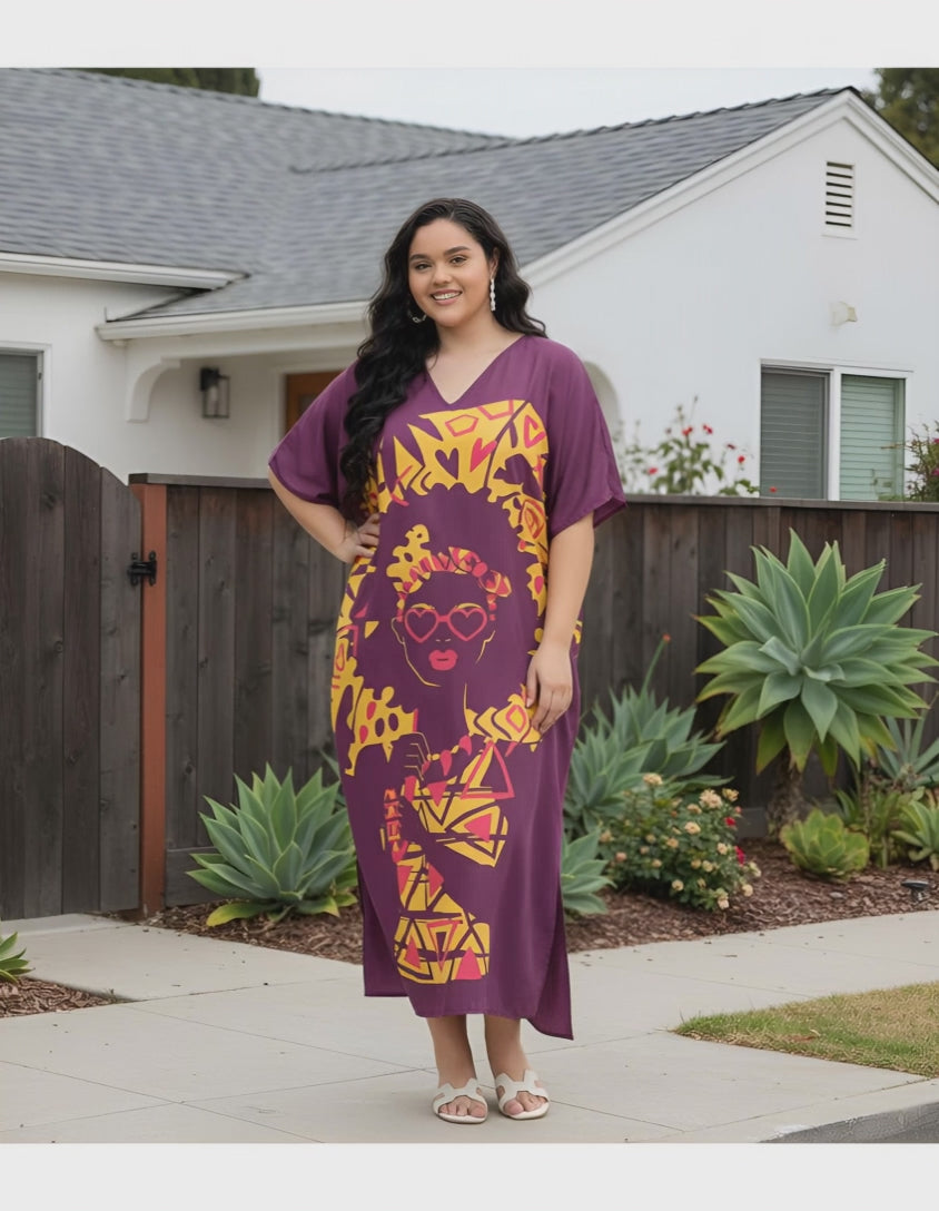 Red & Green Lady Face Polyester Plus Size Kaftan Dress for Women
