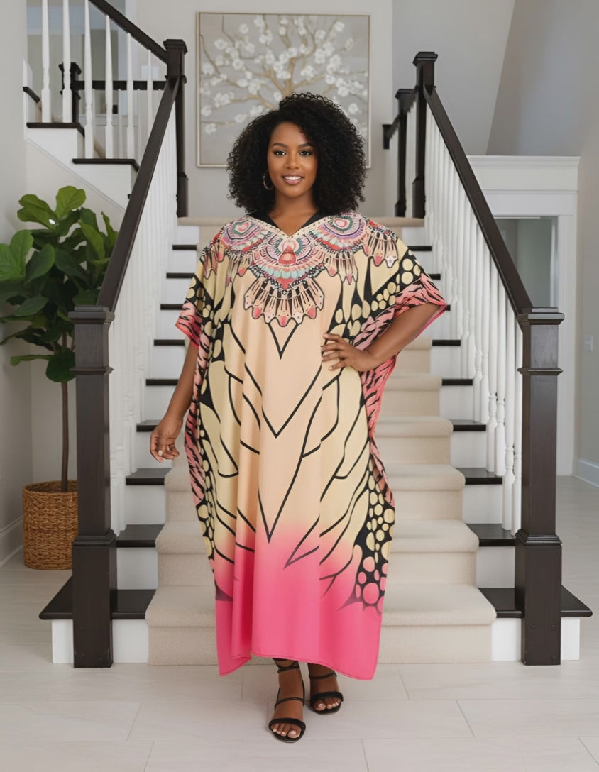 Beige Digital Print Resort Wear Hippie Boho Plus Size Kaftan For Women