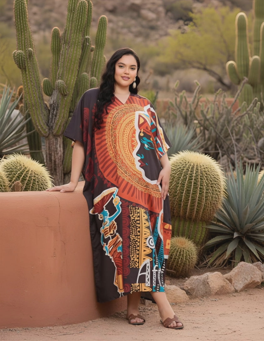 Brown Tribal Satin Women Plus Size Caftan Dress
