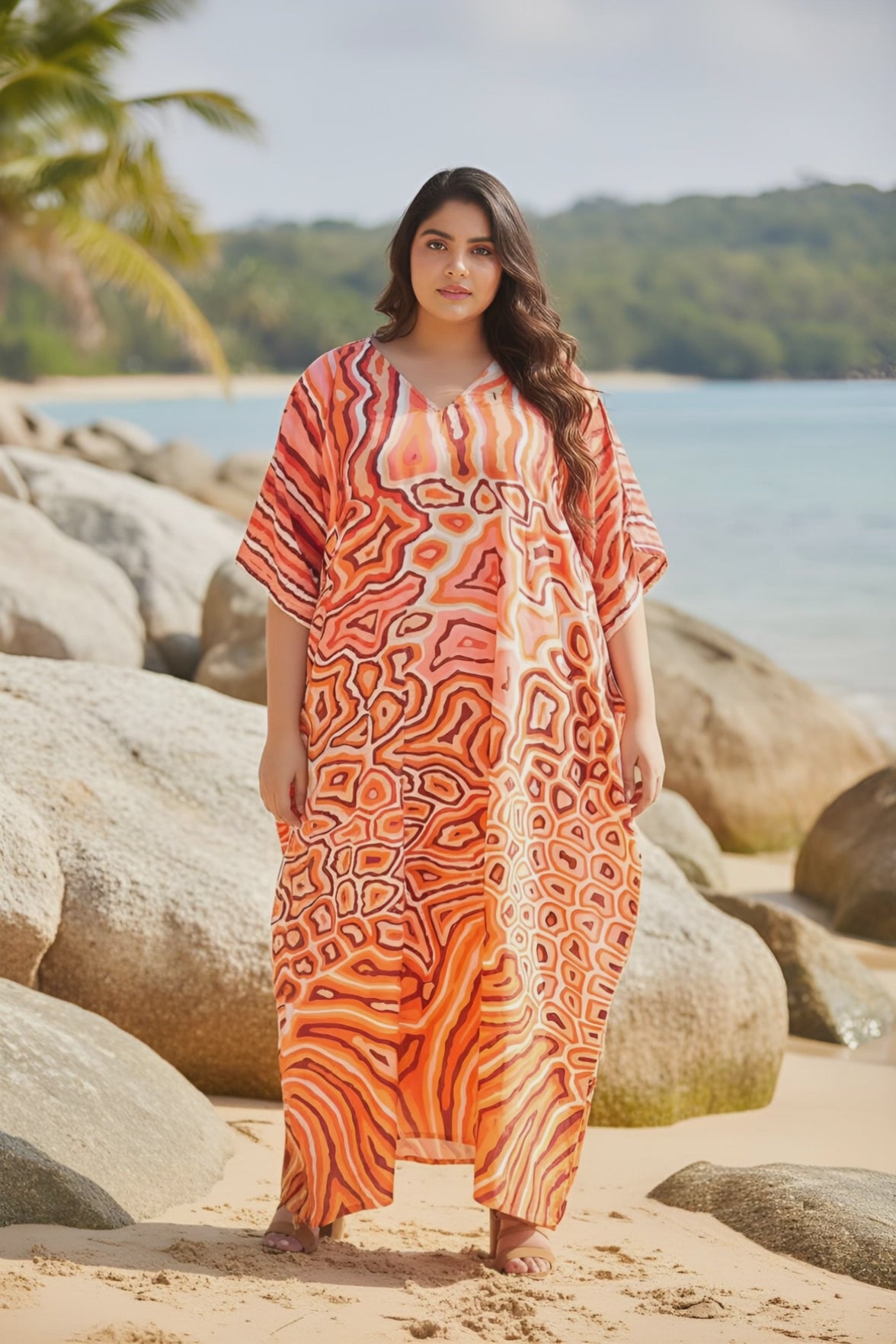 Animal Printed Orange Polyester Kaftan Dress For Plus Size Women