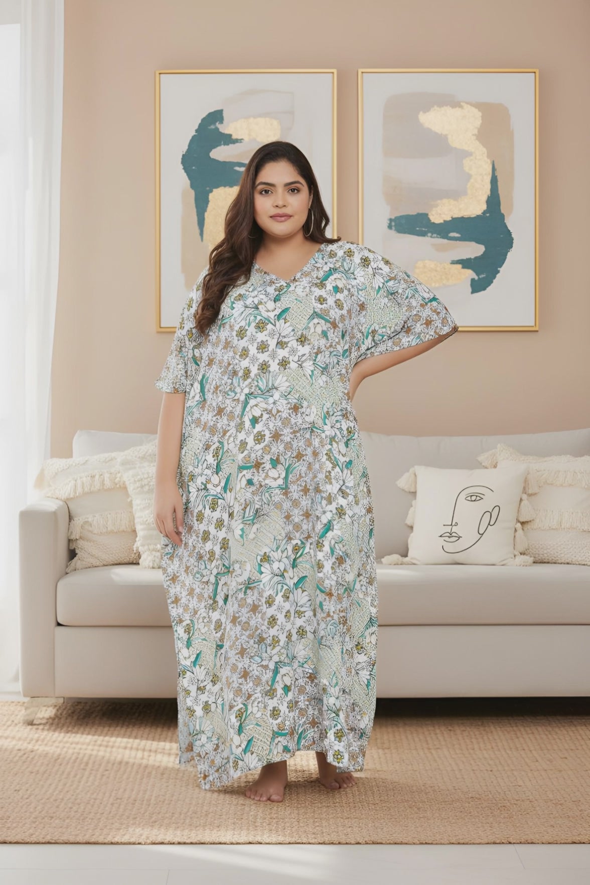 Floral Printed White Polyester Plus Size Kaftan Dress For Women