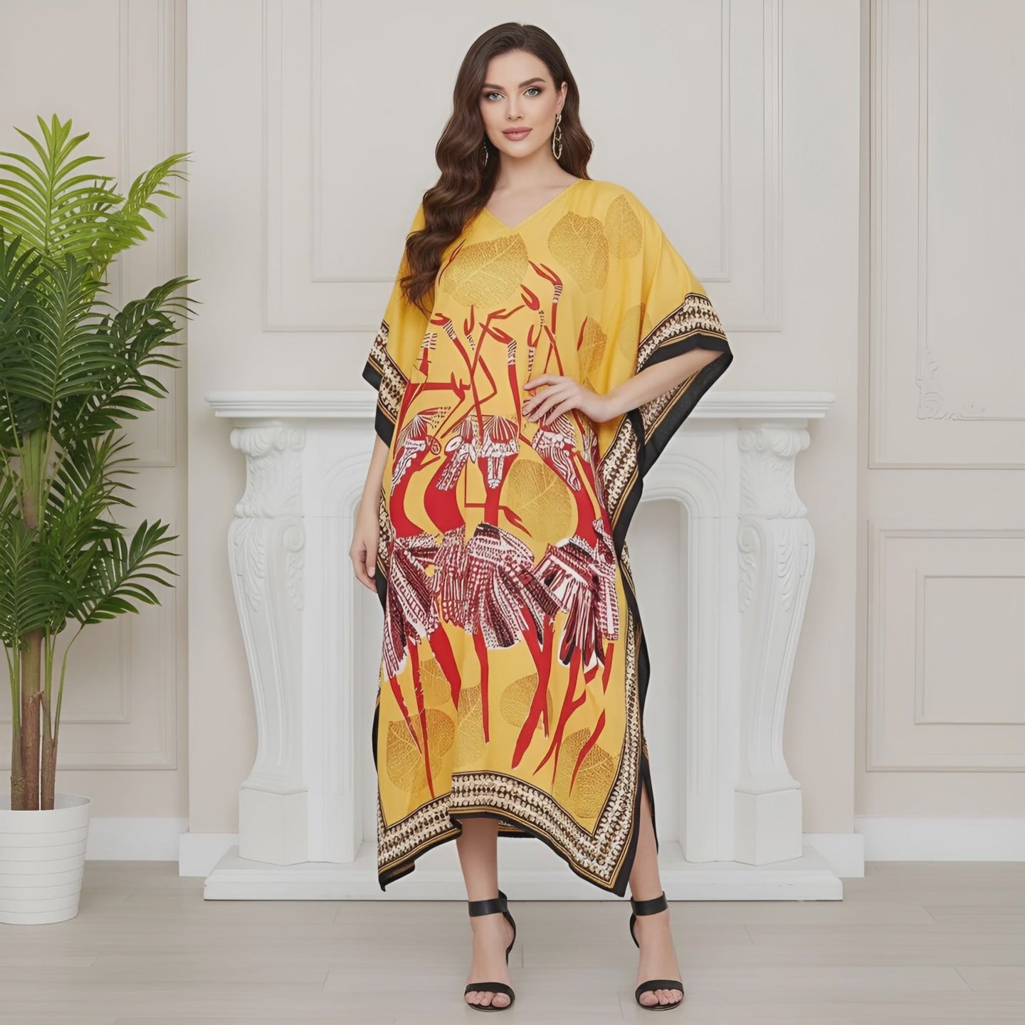 Plus Size Women Tribal Print Yellow Polyester Kaftan