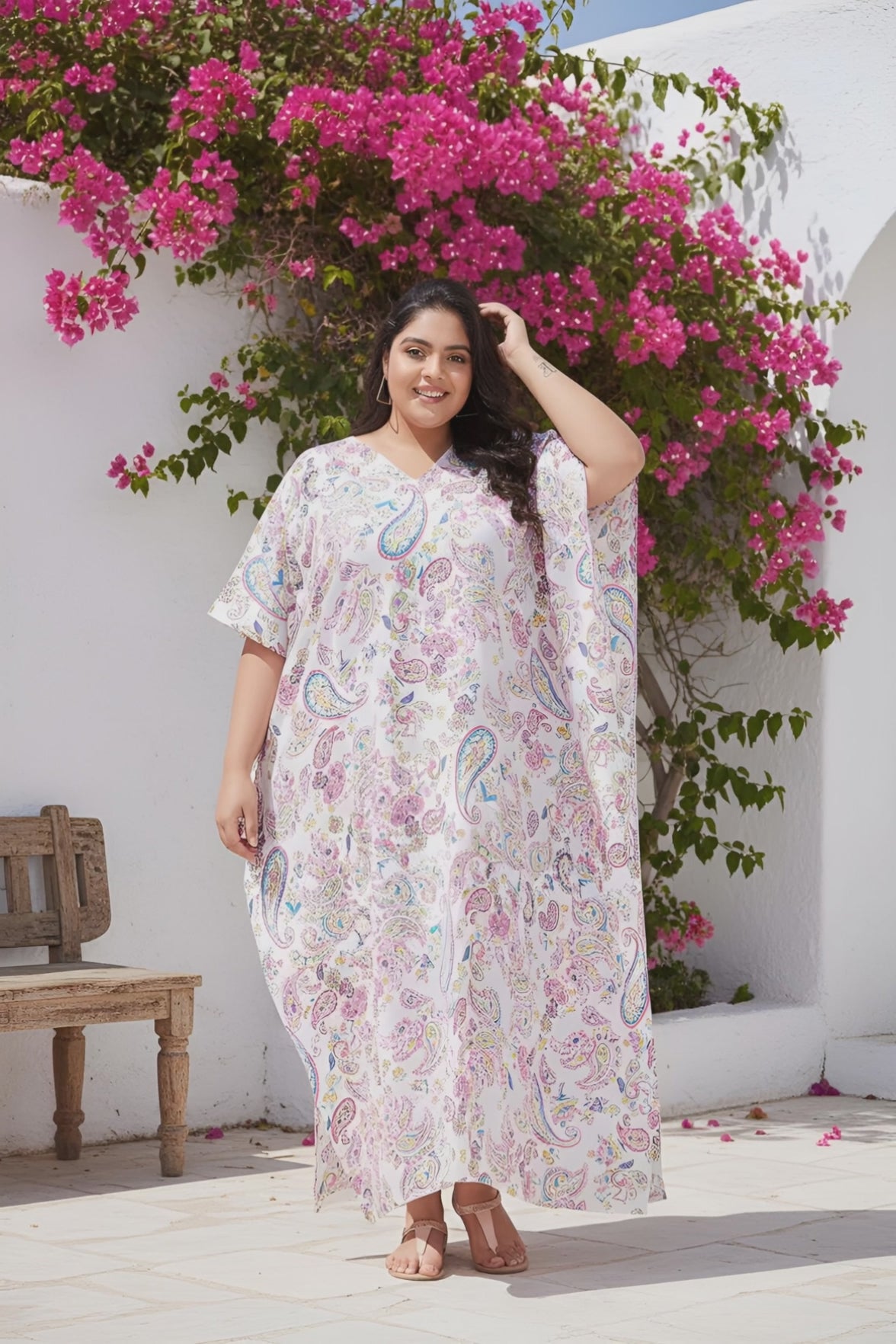 Paisley Printed Pink Polyester Plus Size Kaftan Dress For Women