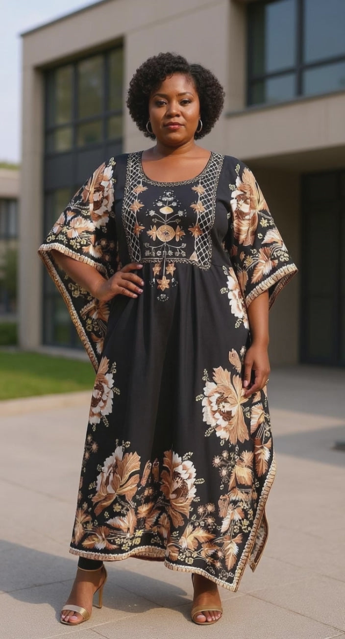 Floral Printed Black Polyester Kaftan Plus Size Dress For Women