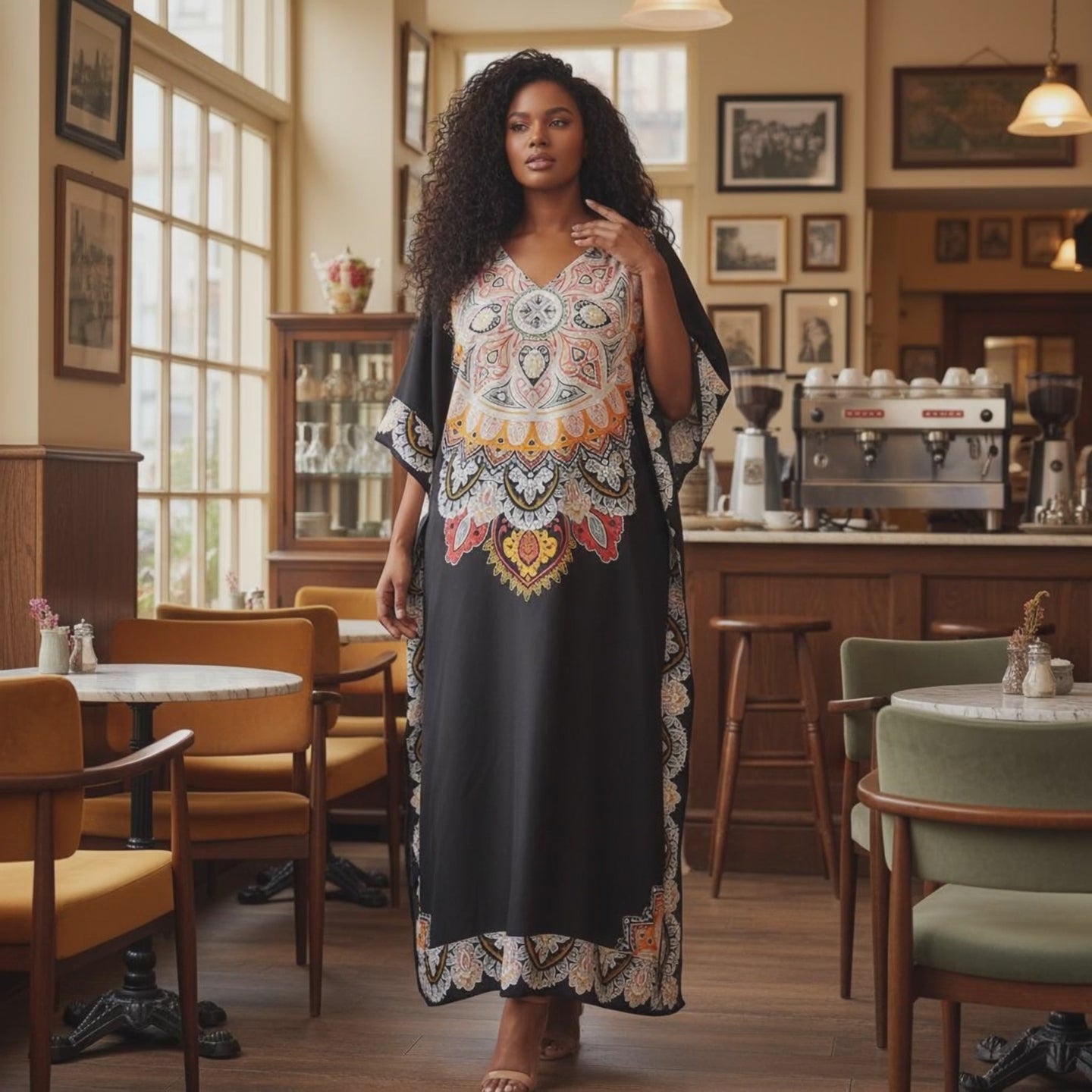 Paisley Printed Black Polyester Plus Size Kaftan Dress For Women