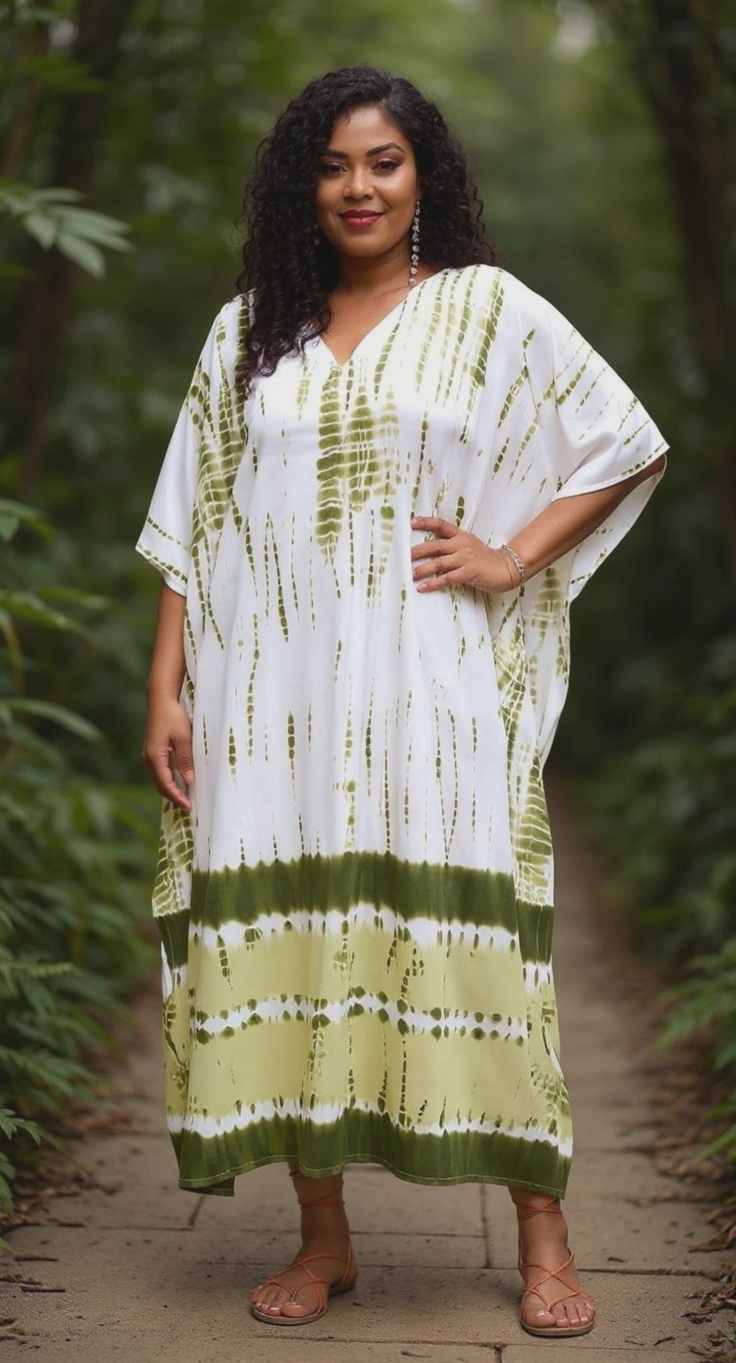 Olive Polyester Kaftan Tie Dye Printed Plus Size Dress For Women