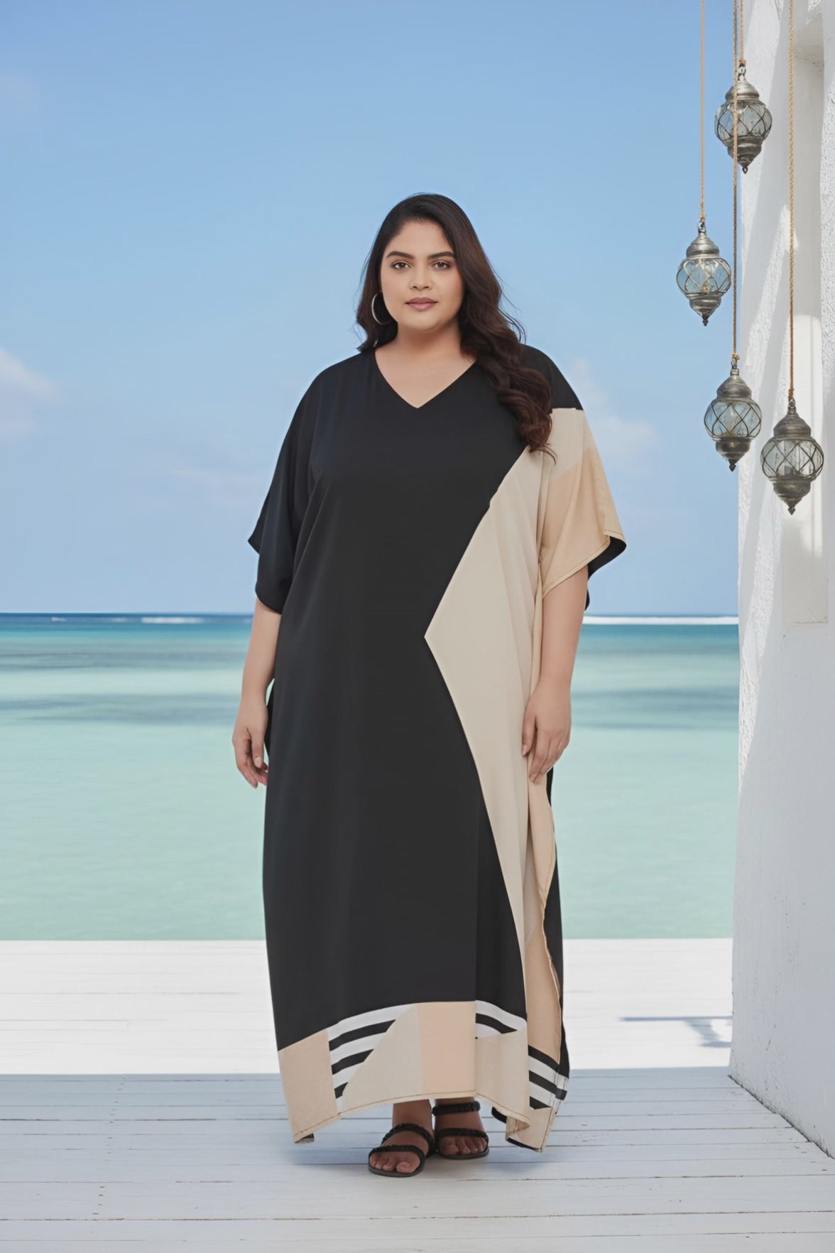 Abstract Black and Cream Polyester Women Plus Size Caftan Dress