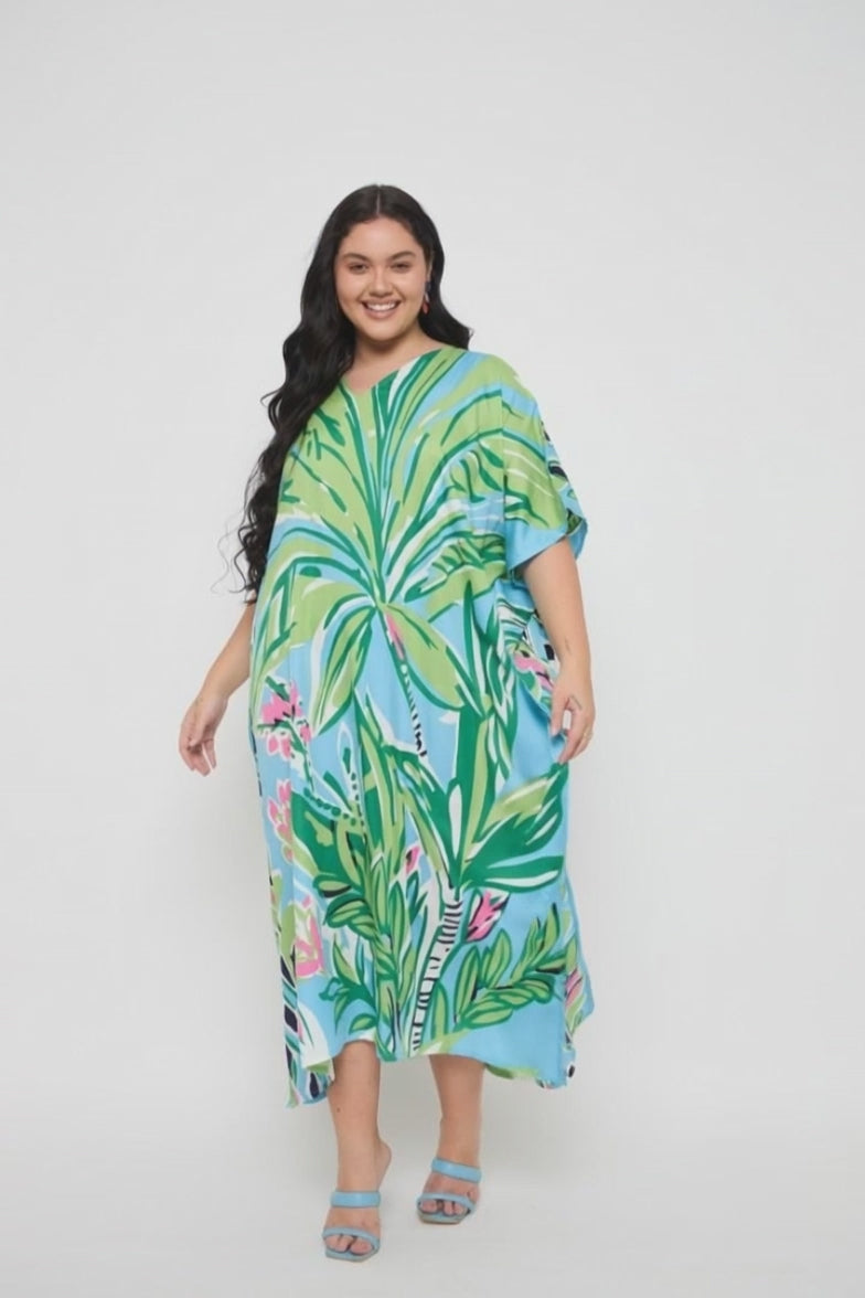 Tropical Leaf Green Polyester Women Plus Size Kaftan Dress