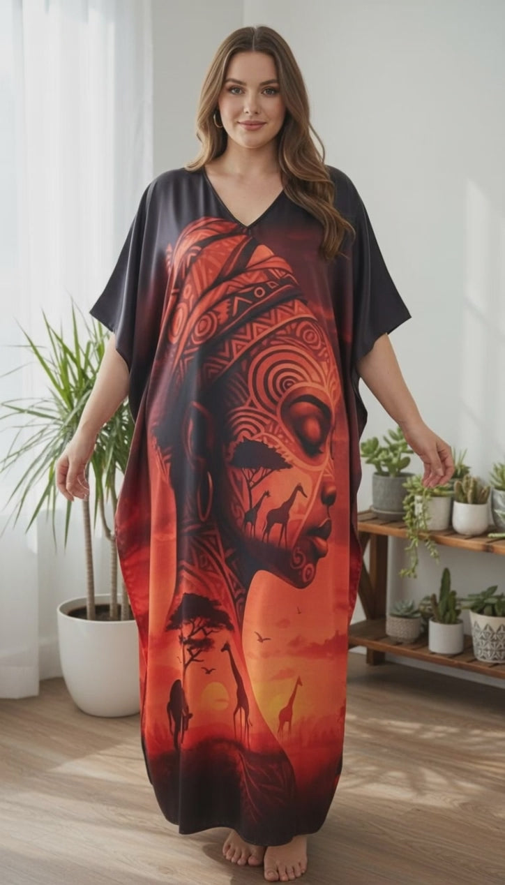 Black Lady Print Satin Plus Size Caftan for Women