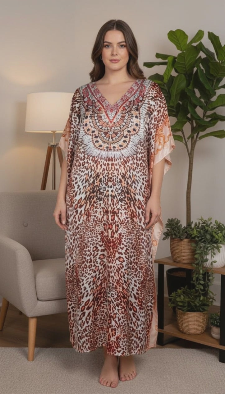 Leopard Print Rust Satin Plus Size Kaftan Dress for Women