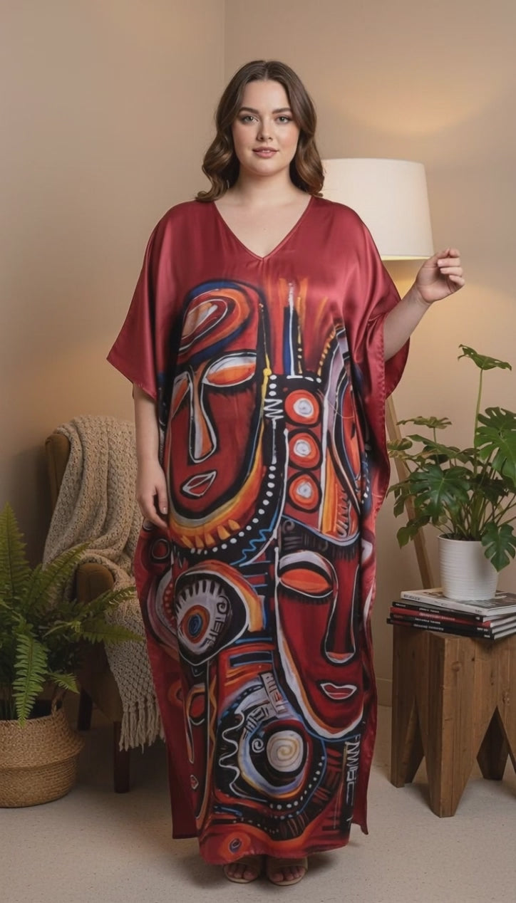Tribal Mask Maroon Satin Plus Size Kaftan Dress for Party Wear