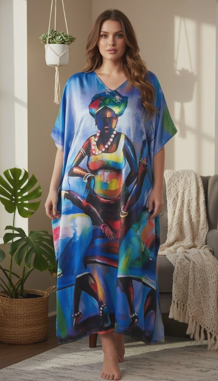 Tribal Lady Blue Satin Plus Size Kaftan Dress for Resort Wear
