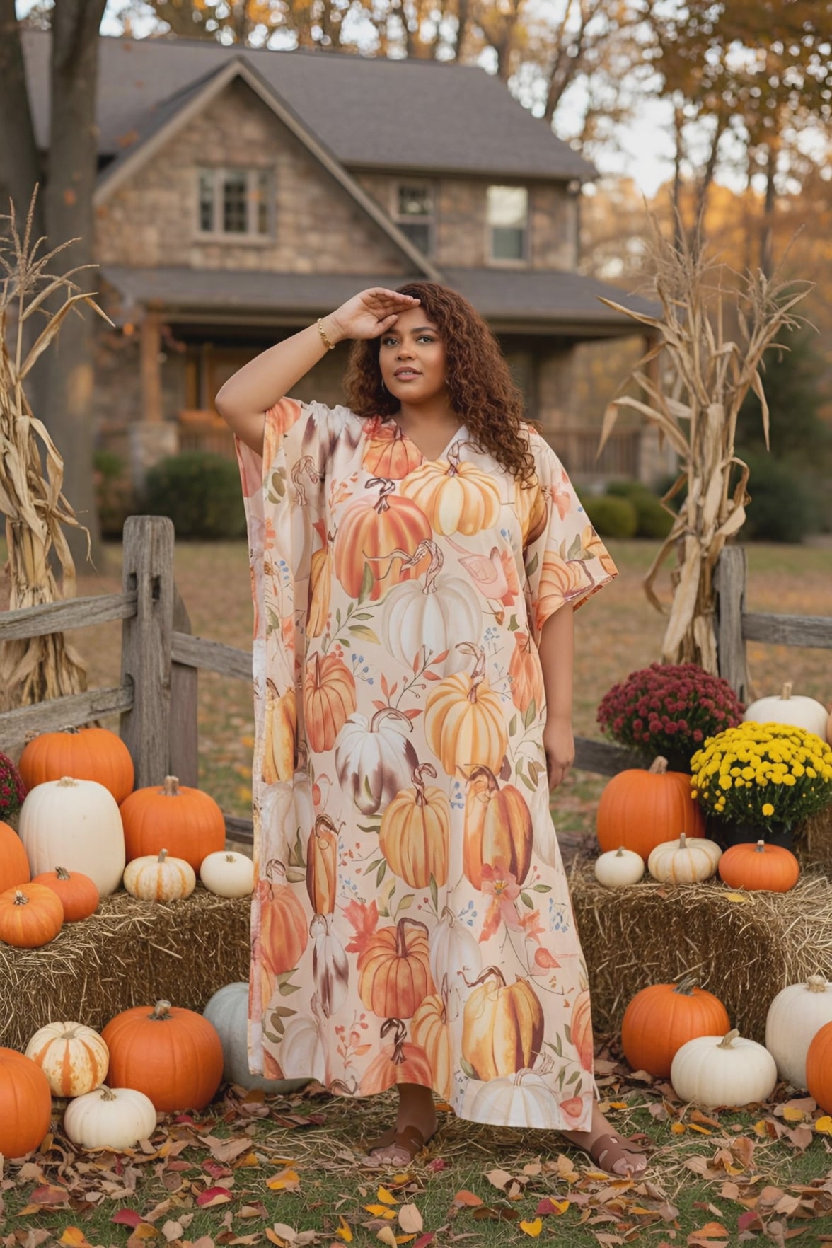 Floral Pastel Orange Polyester Round Neck Kaftan Dress for Plus Size Women