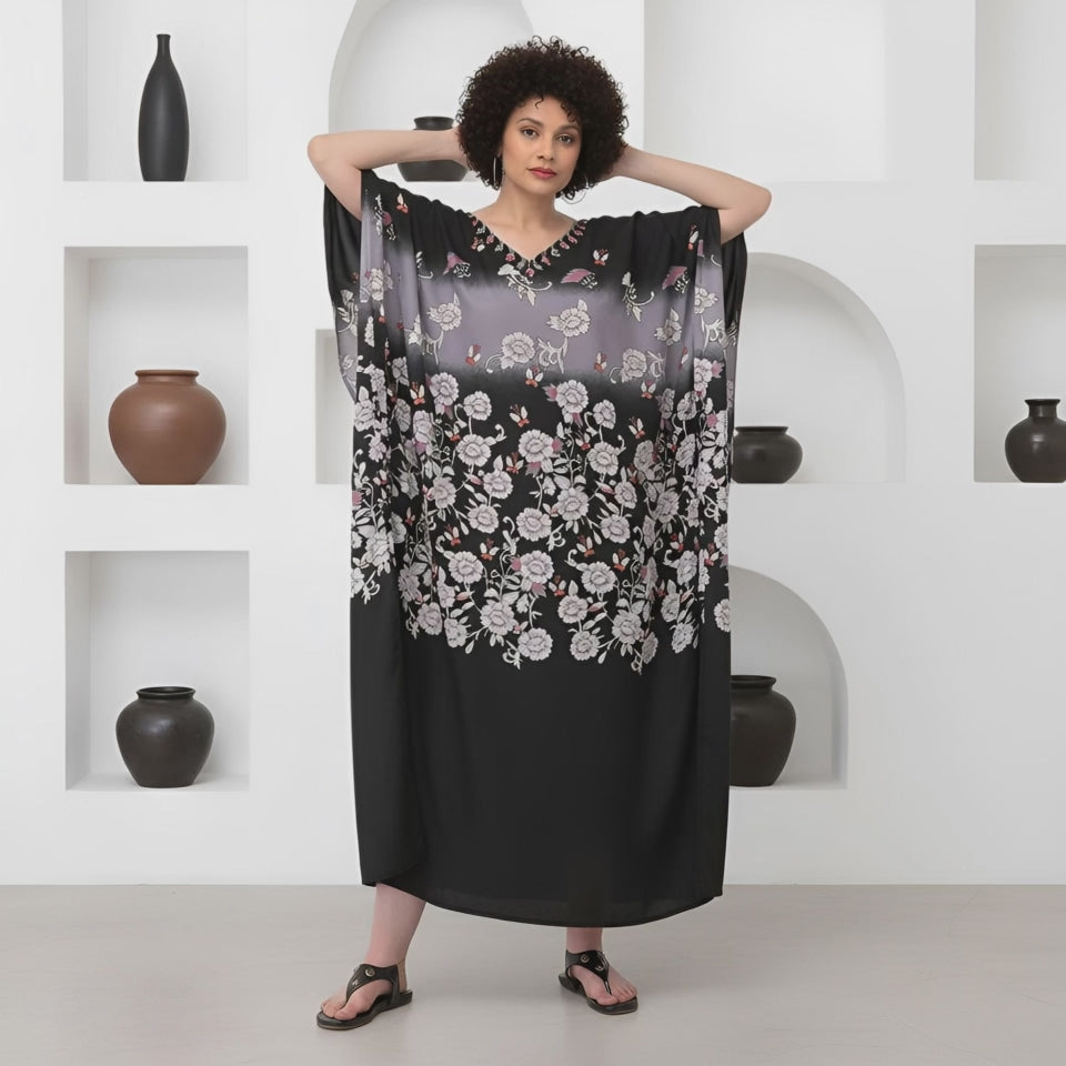 Floral Printed Black Polyester Kaftan Plus Size Dress For Women
