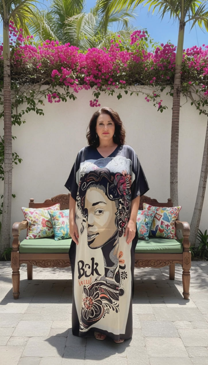 Multicolor Lady Print Satin Plus Size Kaftan Maxi Dress Resort Look