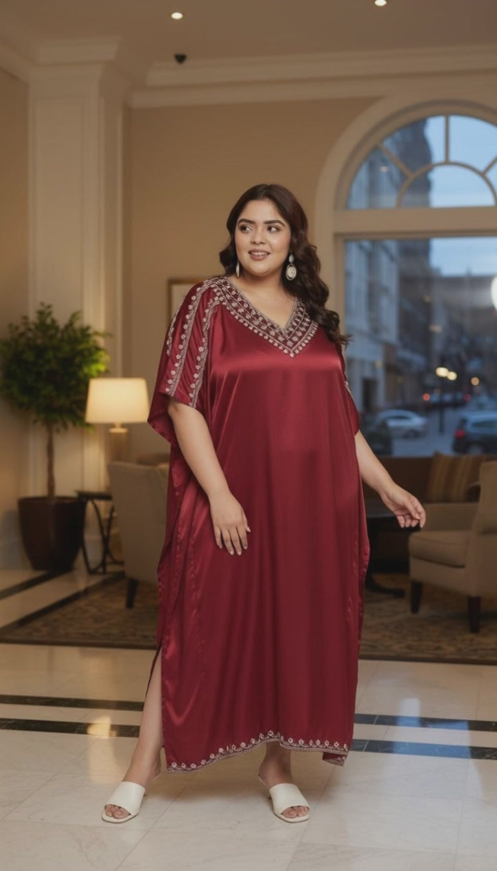 Jester Red Satin Caftan Dress For Plus Size Women With Embroidery