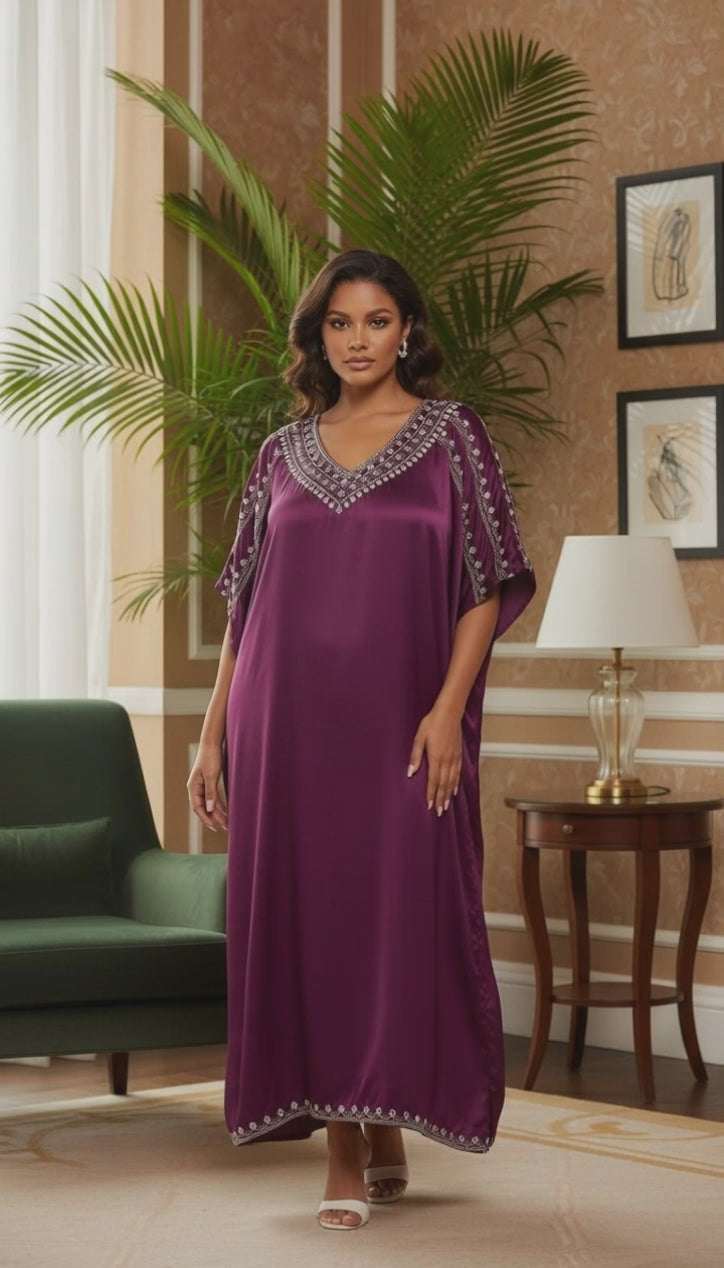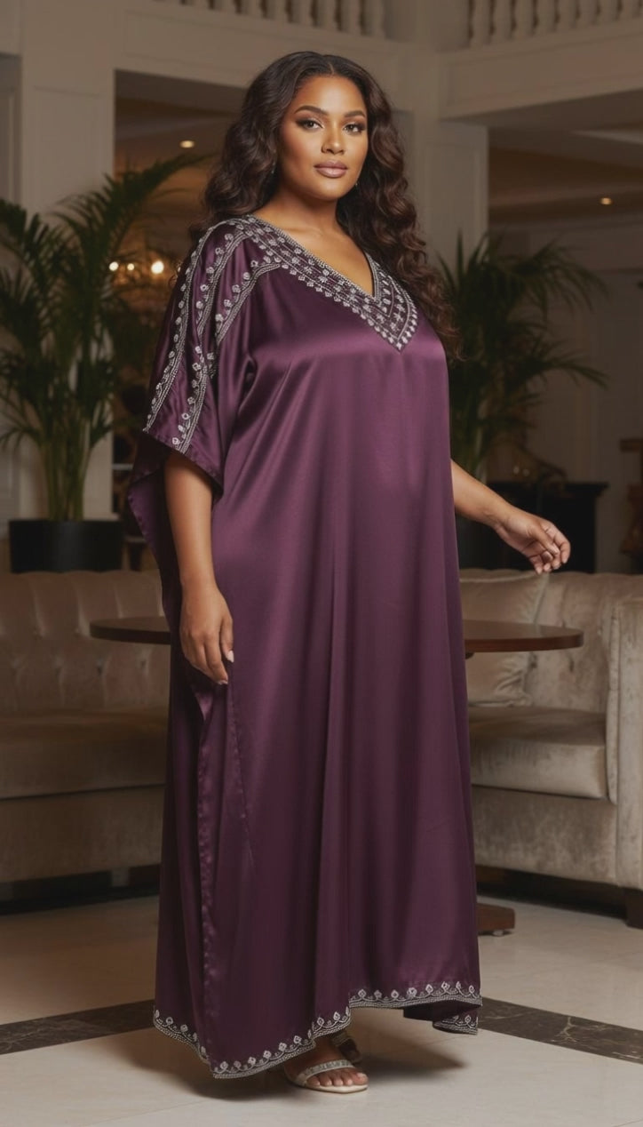 Solid With Embroidery Lace Purple Satin Kaftan For Plus Size Women
