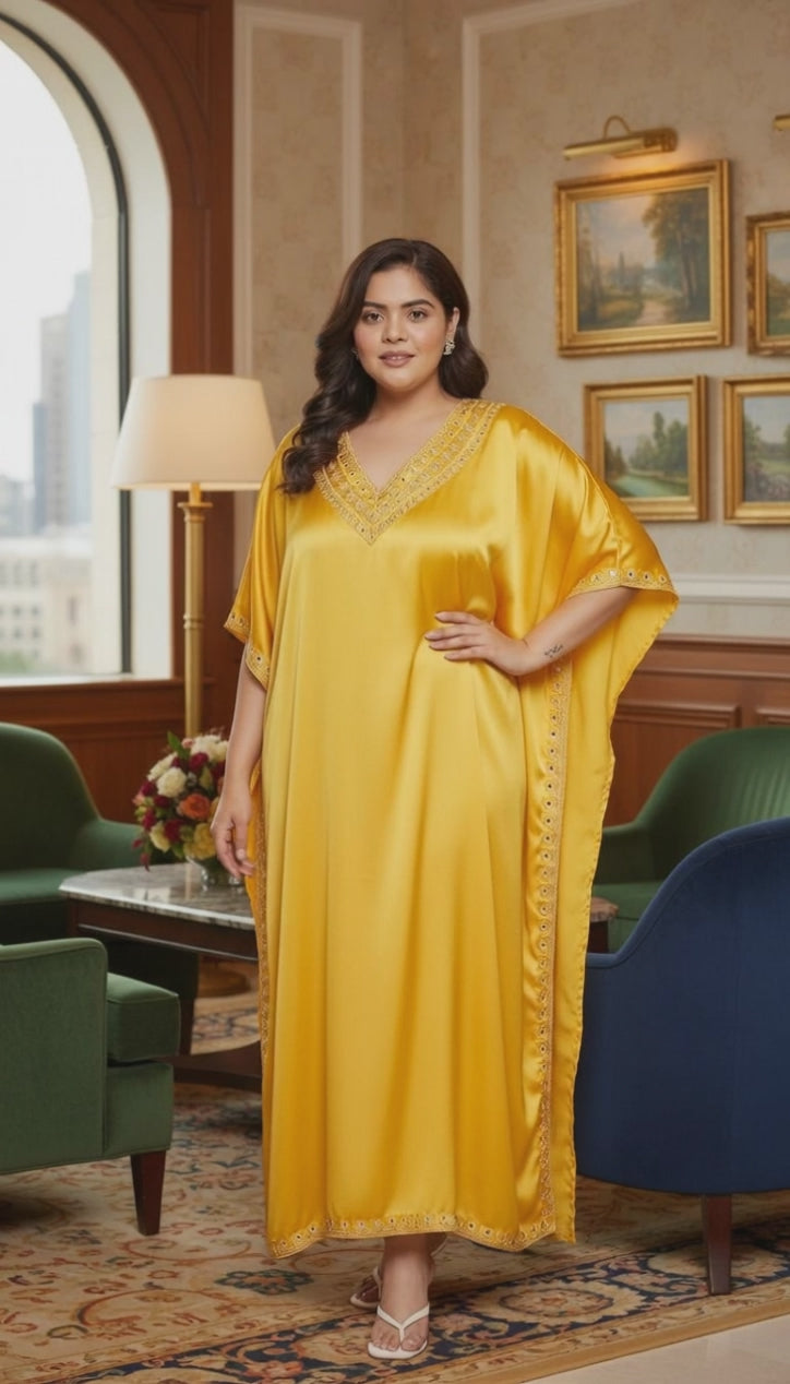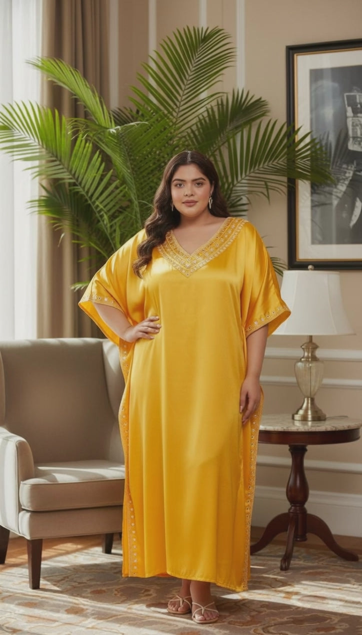 Embroidery Yellow Satin Kaftan Dress For Plus Size Women