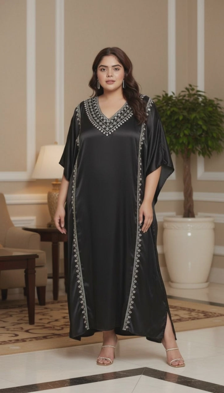 Black Satin Solid with Embroidery Lace Kaftan For Plus Size Women