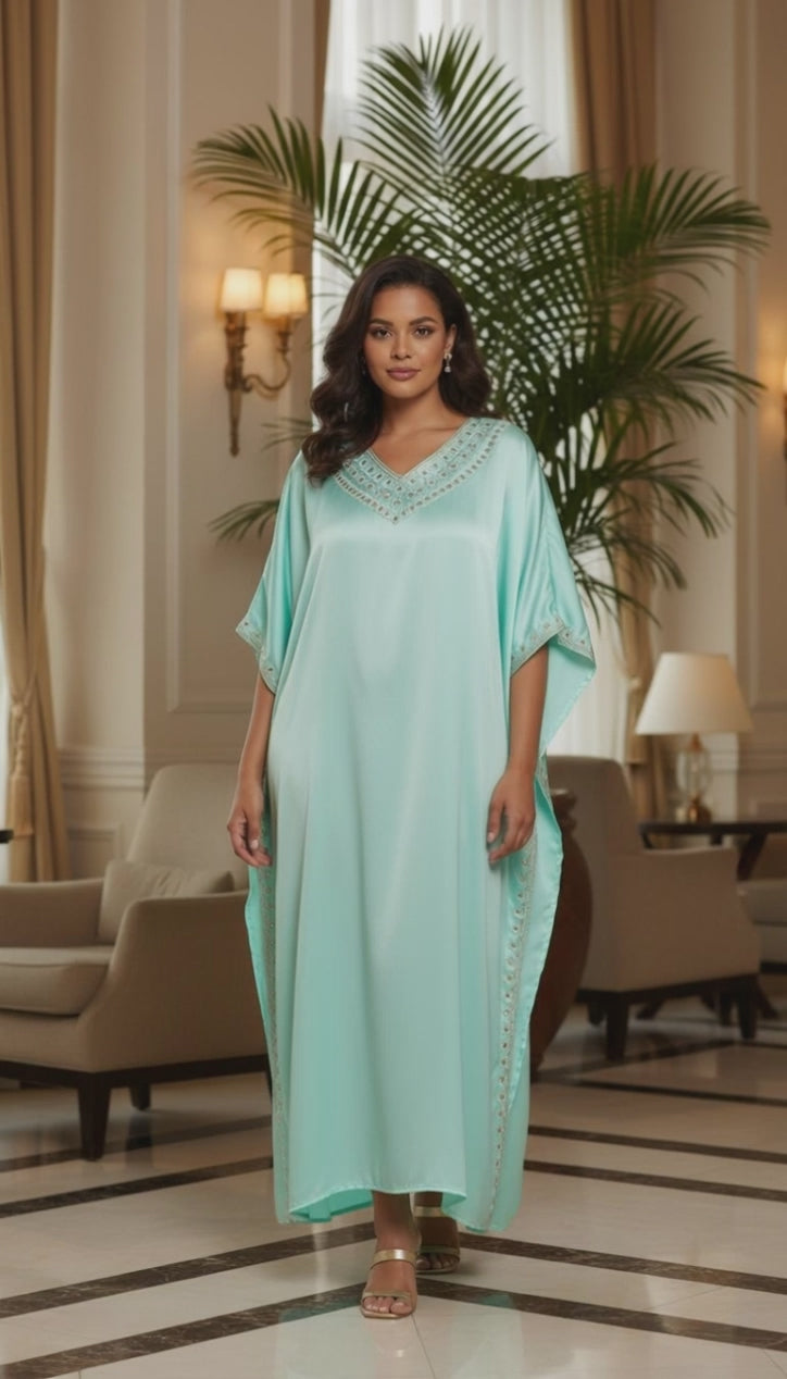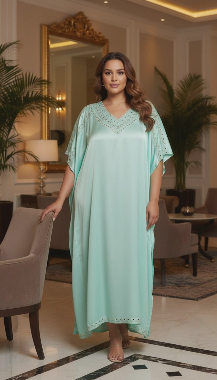 Women Satin Kaftan Plus Size Solid with Embroidery Ice Green
