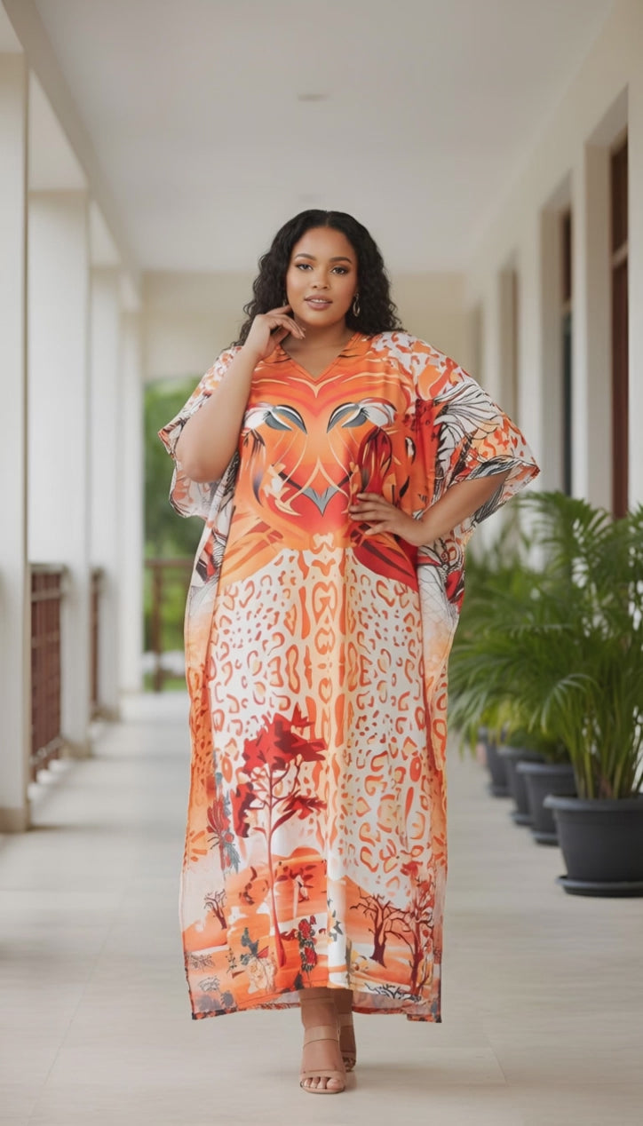 Orange Paisley Pattern Kaftan Dress For Plus Size Women