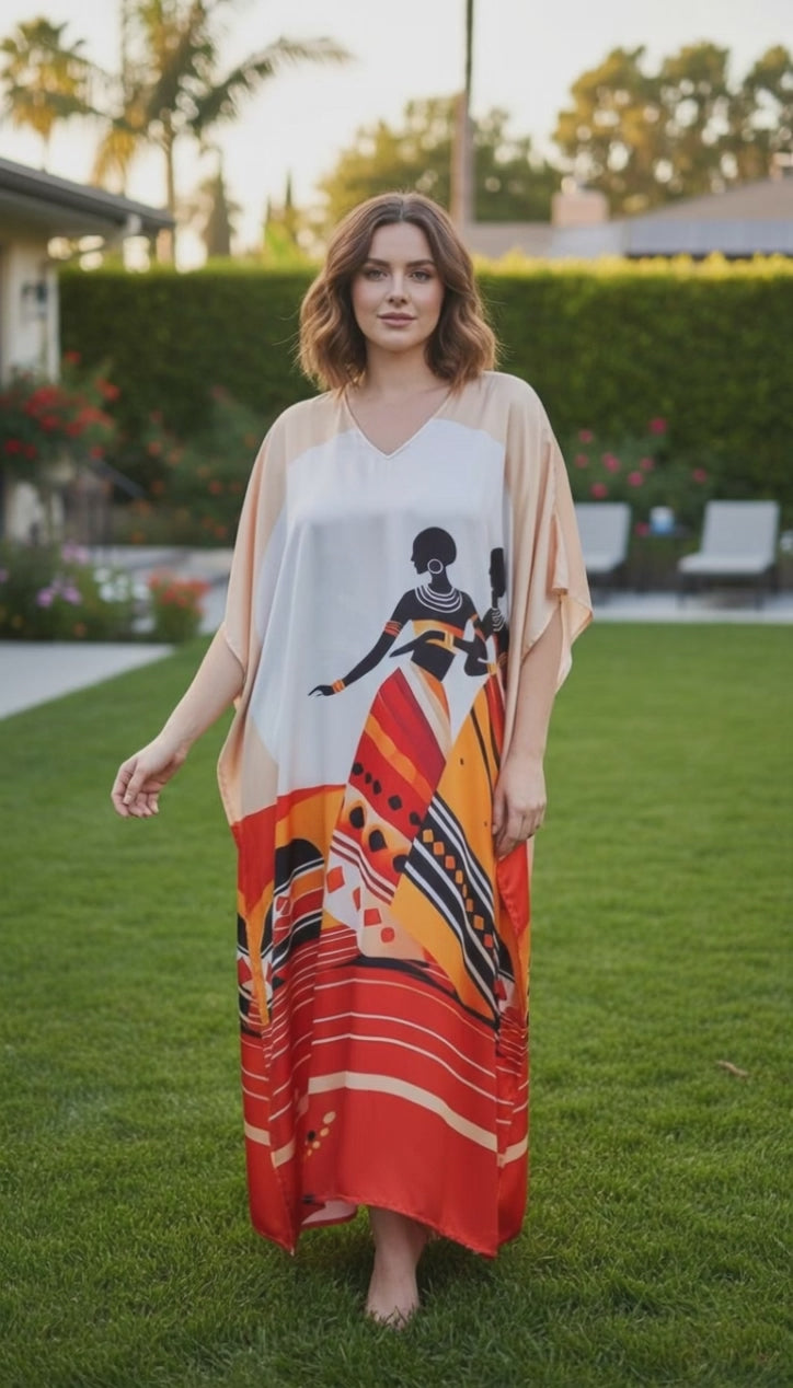 Bright Orange Lady Print Satin Plus Size Kaftan Maxi Dress Beach Holiday