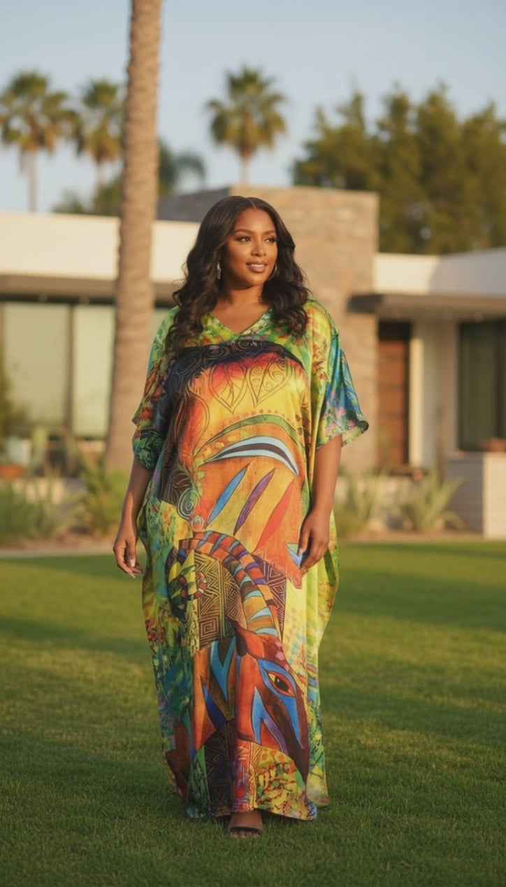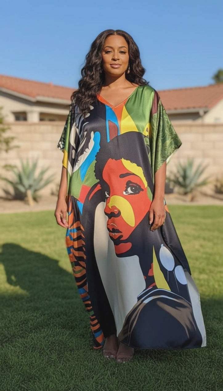 Multicolor Lady Print Satin Plus Size Kaftan Maxi Dress Resort Look