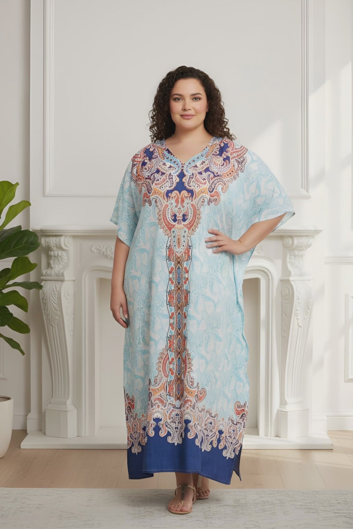 Paisley Turquoise Polyester Plus Size Kaftan Dress for Beach