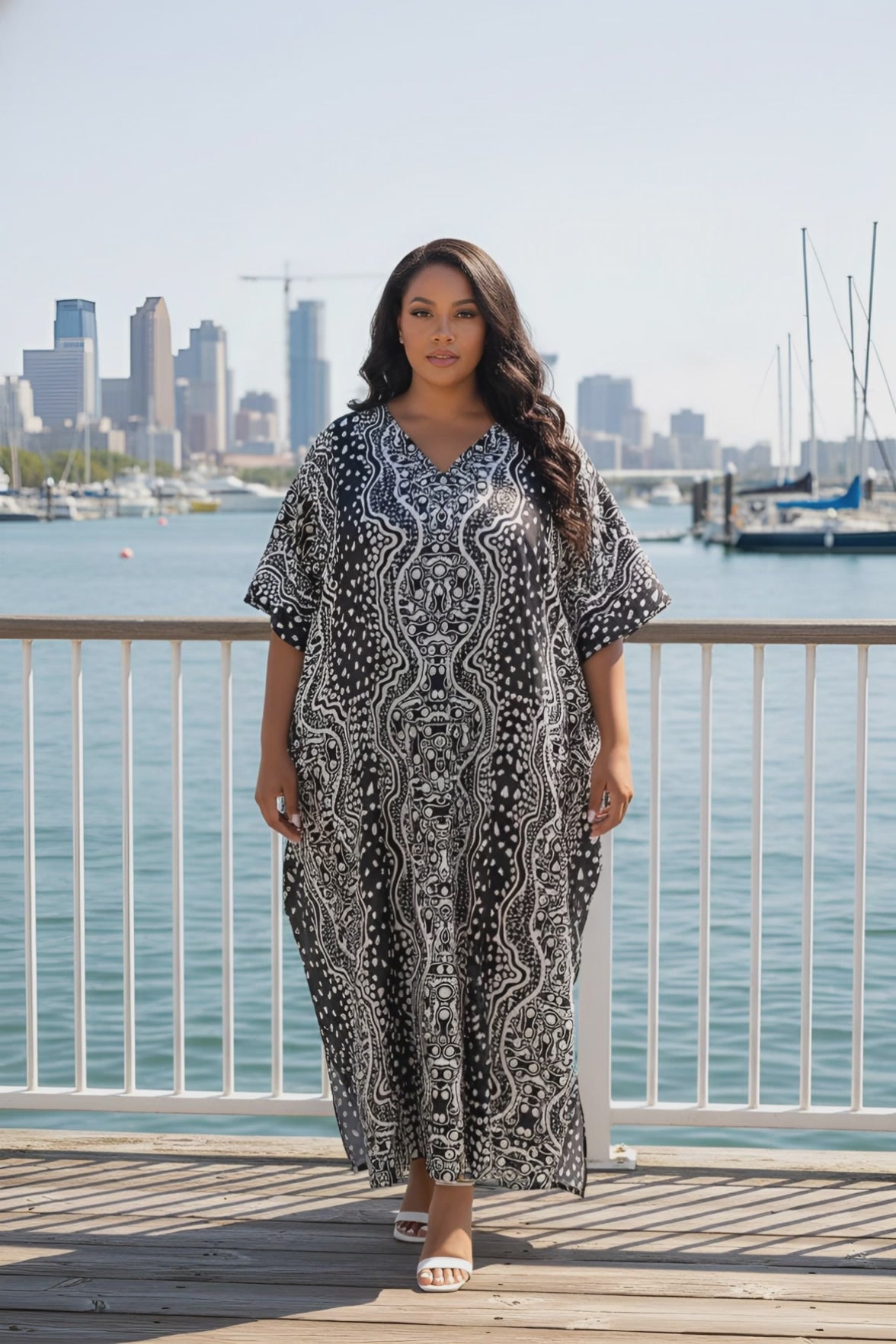 Mandala Print Black And White Polyester Kaftan For Plus Size Women