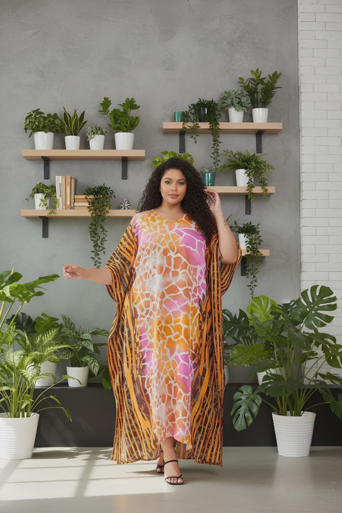Animal Printed Orange Polyester Kaftan Dress For Plus Size Women