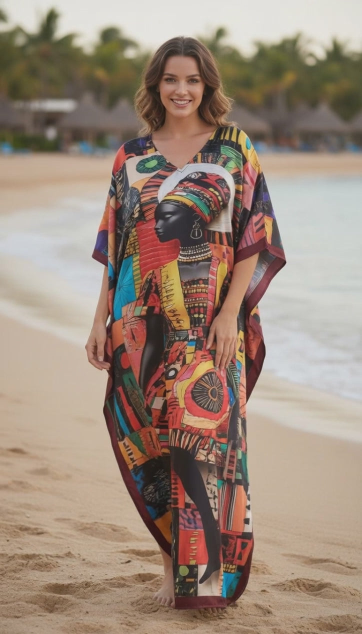 African Print Multicolor Satin Plus Size Women Kaftan Dress Resort Evening Wear