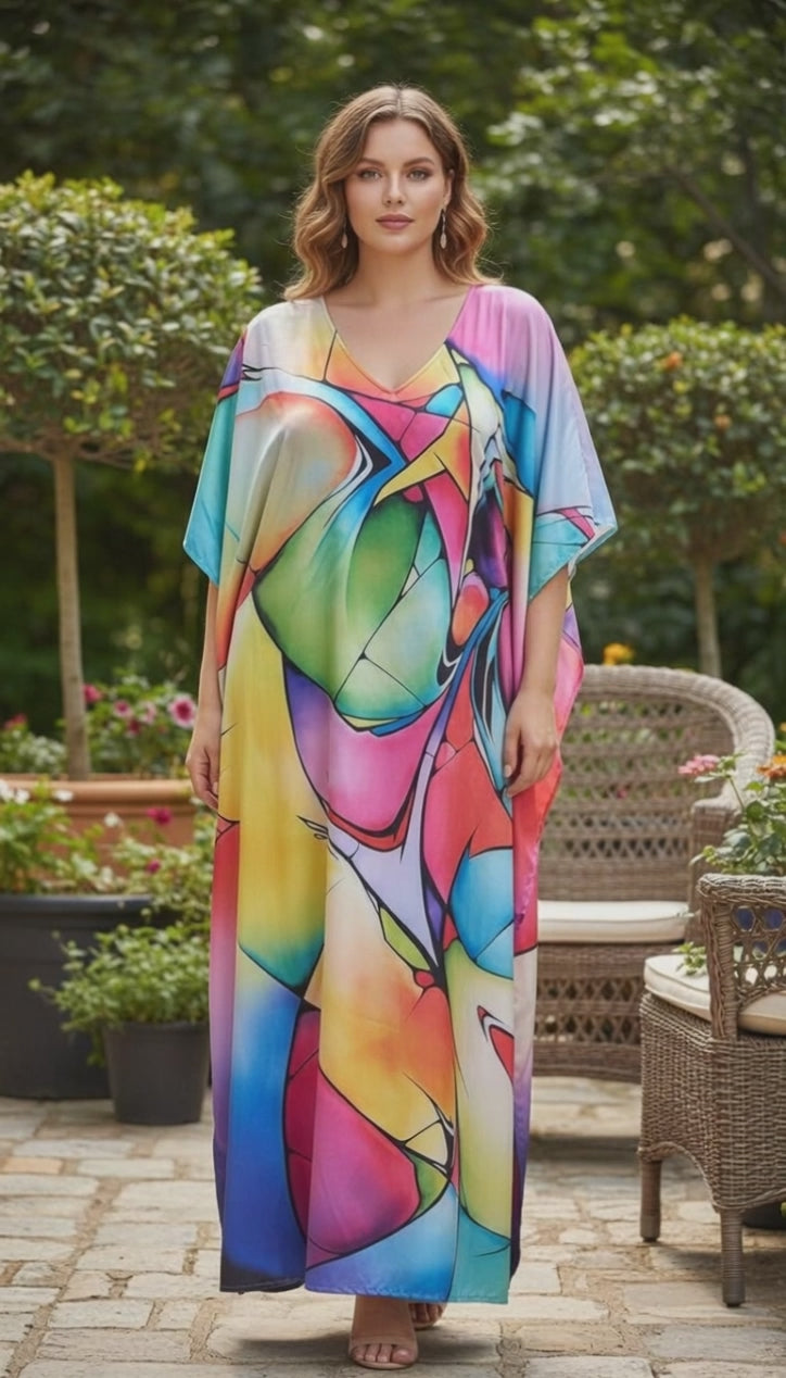 Abstract Multicolor Satin Plus Size Women’s Kaftan for Resort Vacations