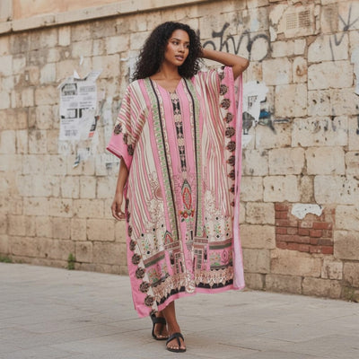 Pink Mughal Strip Design Polyester Plus Size Kaftan For Women