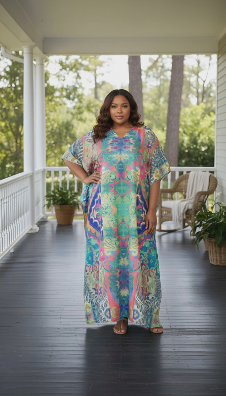 Elevate your wardrobe with our Abstract Printed Multicolor Polyester Kaftan Plus Size Dress for Women. Embrace comfort and style with perfect for any occasion.