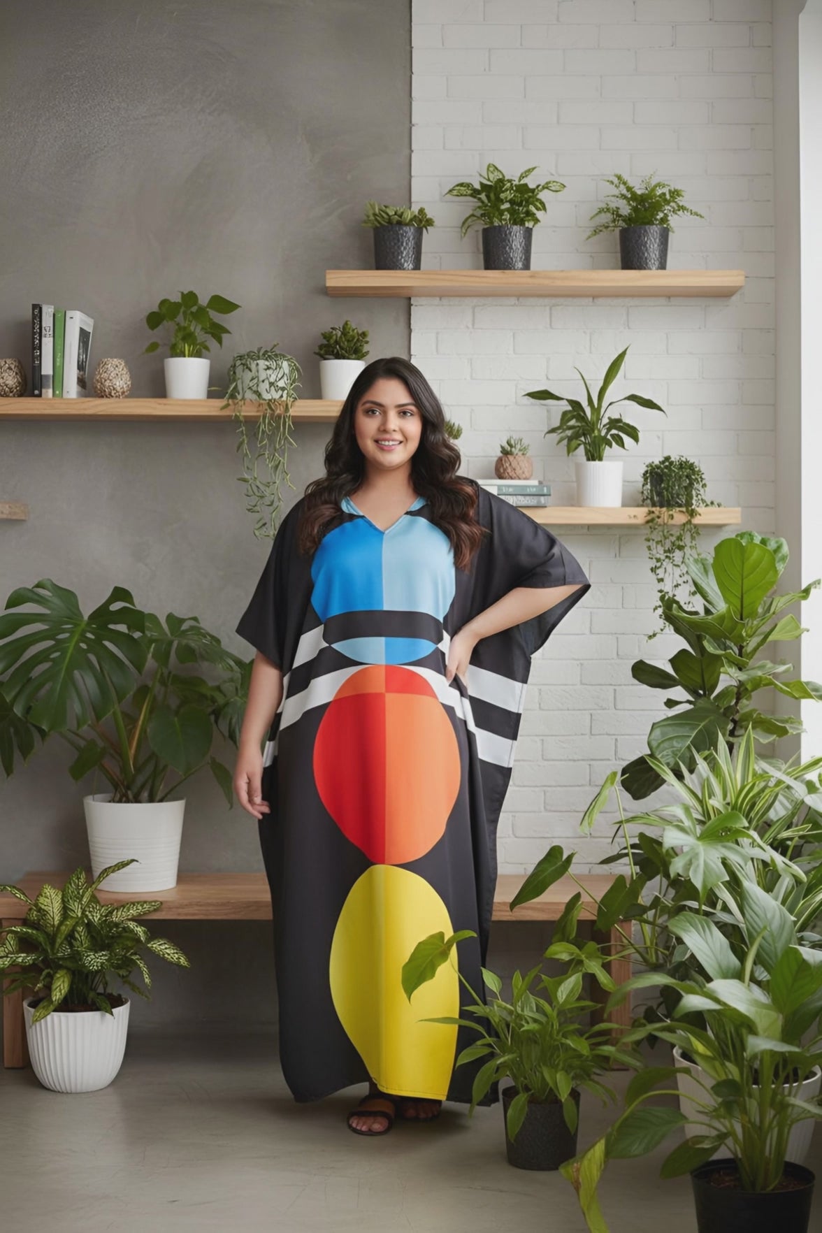 Take a look at our stylish geometric print kaftans in black and multicolor polyester, designed to add elegance to the wardrobe of plus size women.