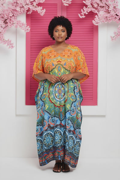 Shop our stunning abstract printed kaftan dress in multicolor, made of comfortable and durable polyester fabric. Perfect for plus size women. Shop Now
