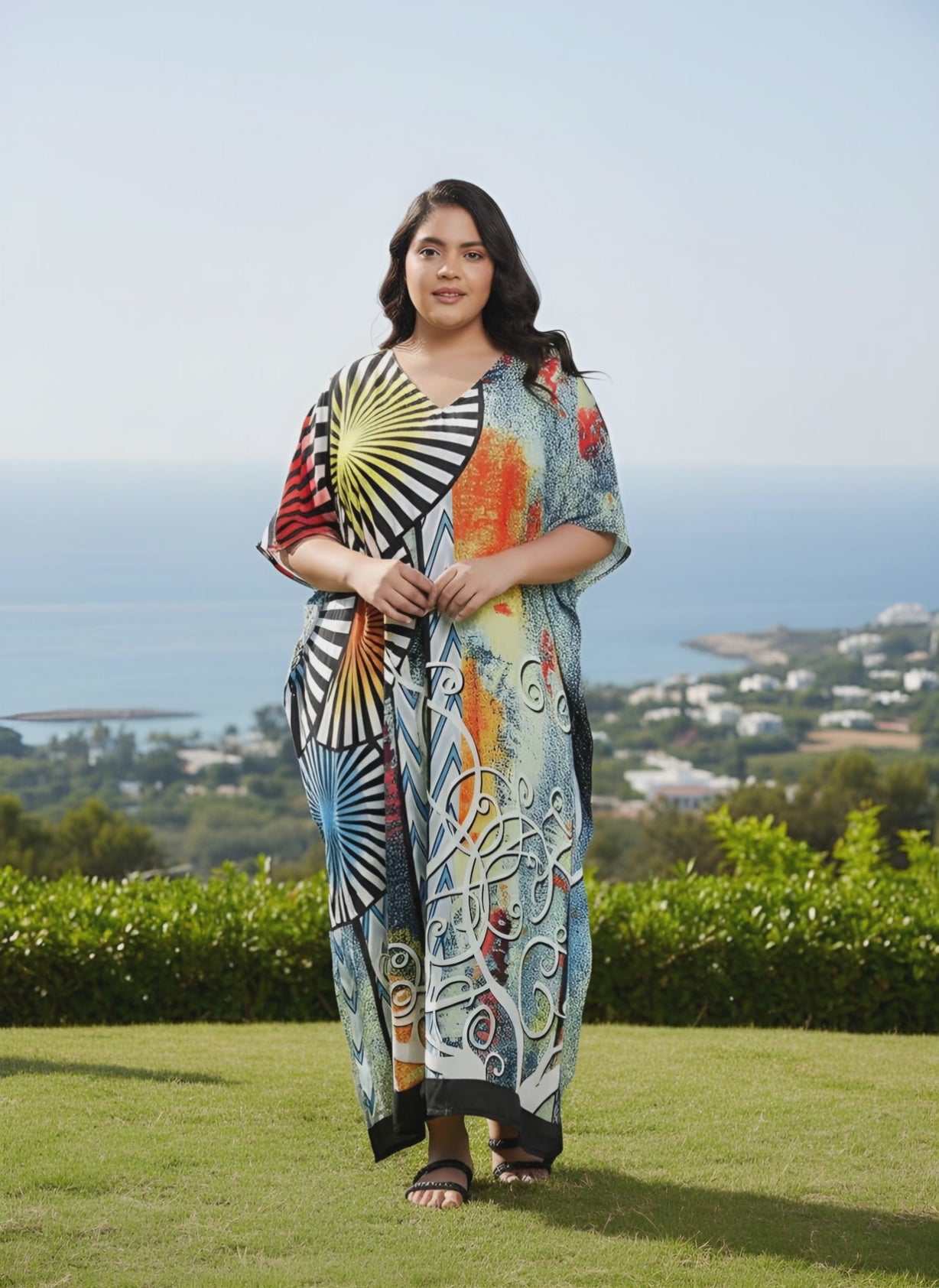 Elevate your wardrobe with our collection of Abstract Printed Multicolor Plus Size Polyester Kaftan Dresses for Women. Find your perfect fit and style today