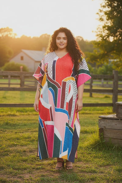 Find the perfect blend of style and comfort with our Abstract Printed Multicolor Polyester Kaftan Dress, designed especially for plus-size women. ensuring you fit best.