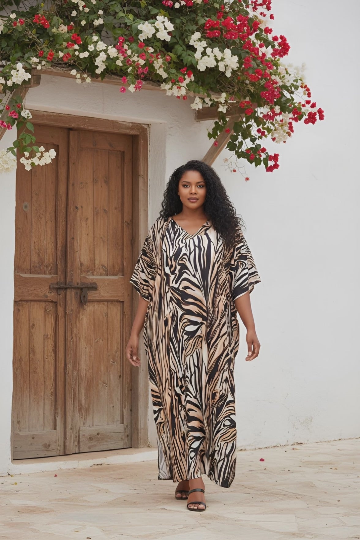 Embrace your fierce and fabulous side in our Abstract Brown and Black Polyester Women Kaftan Beach Cover up. Discover your confident style now
