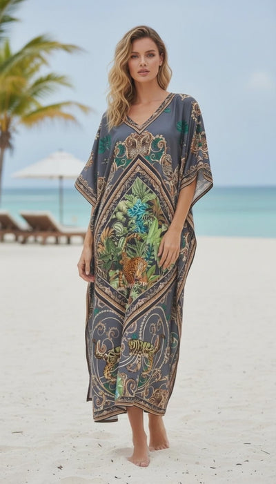 Make a bold fashion statement with this animal printed gray polyester kaftan, specially designed for plus size women. Comfortable and stylish, perfect for any occasion |