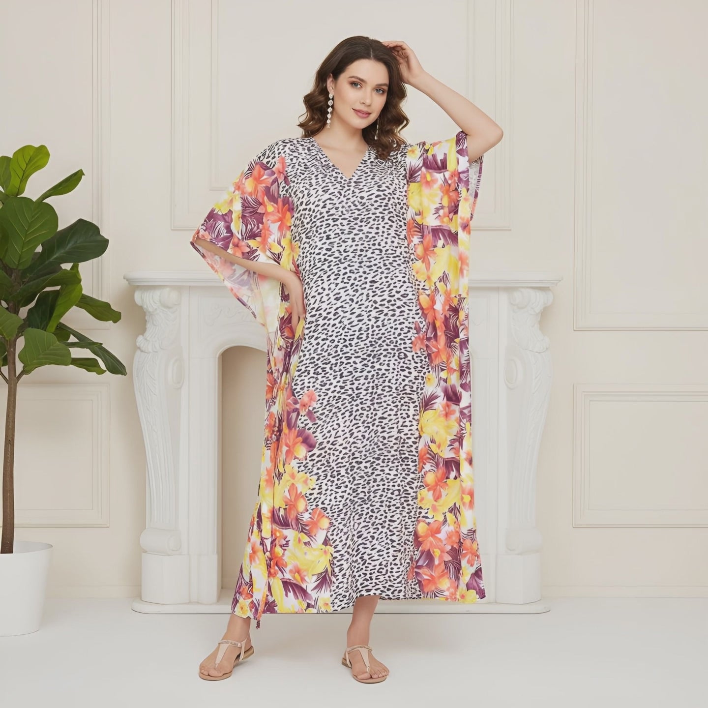 Make a fashion statement in this vibrant multicolor animal printed polyester kaftan dress, tailored for plus-size women. Perfect blend of style and comfort for any occasion