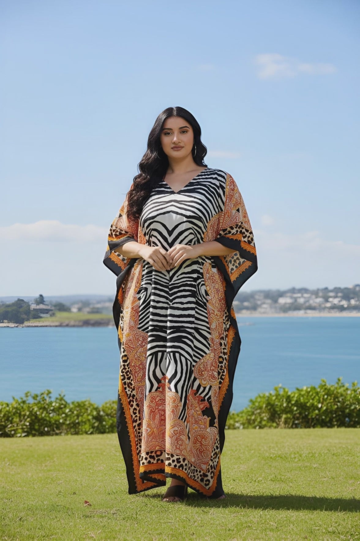 Elevate your style with this chic multicolor animal printed polyester kaftan dress designed for plus-size women. Perfect for making a statement with comfort and confidence