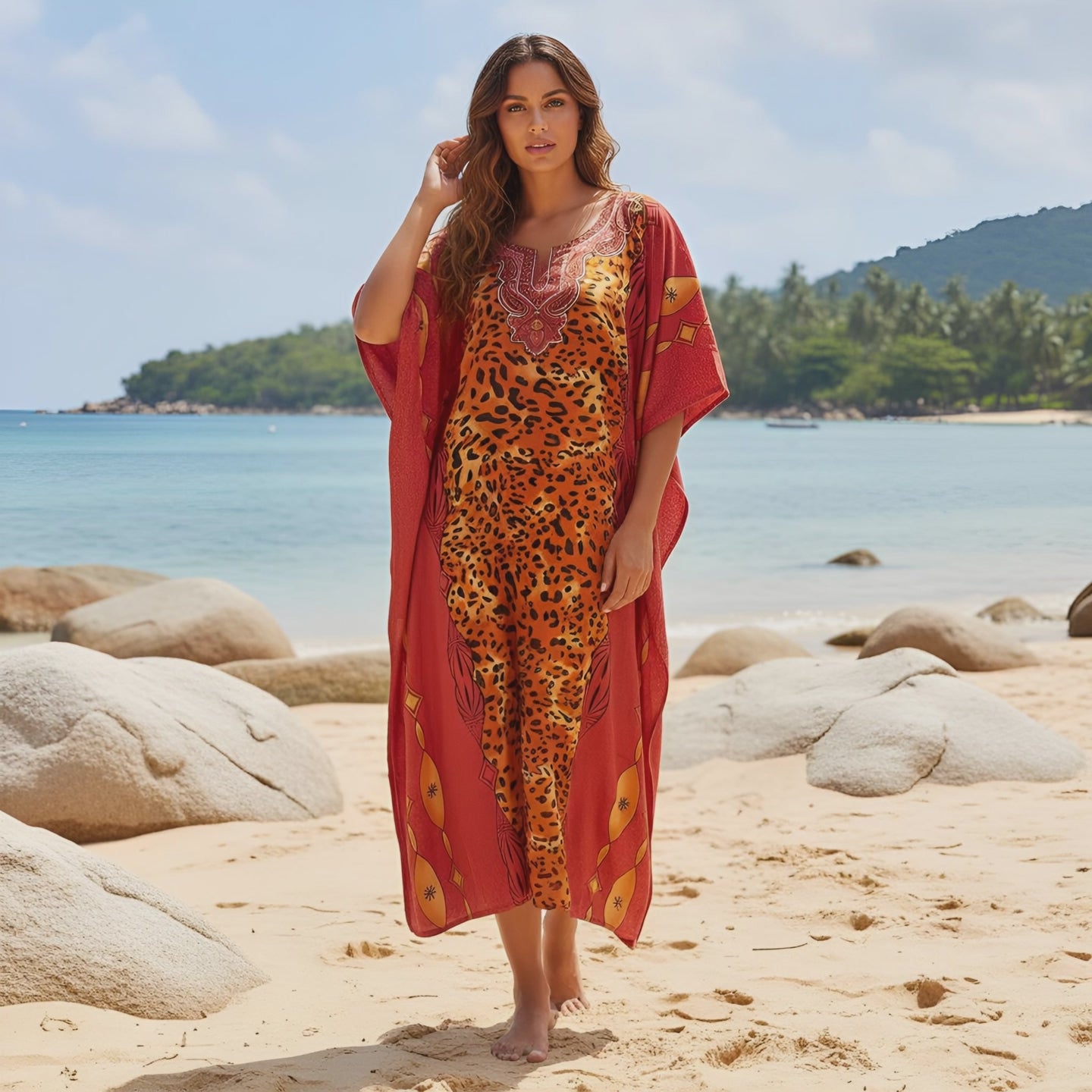Leopard Printed Red Polyester Caftan Dress for Women