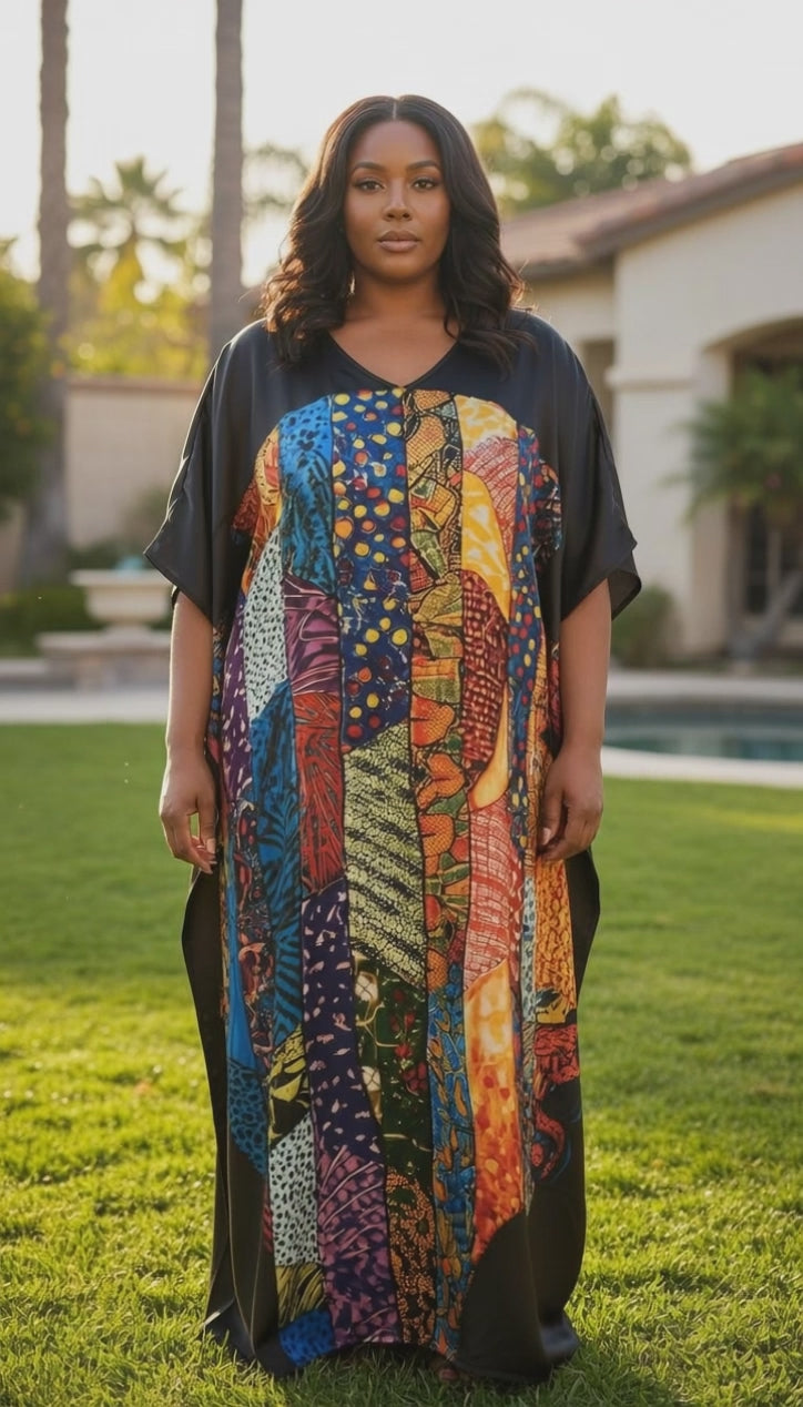 Soft satin kaftan maxi dress for women with vibrant prints and loose free‑size fit. Perfect women’s kaftan dress for beach cover up, resort holidays, casual party wear, daily loungewear and plus size comfort.