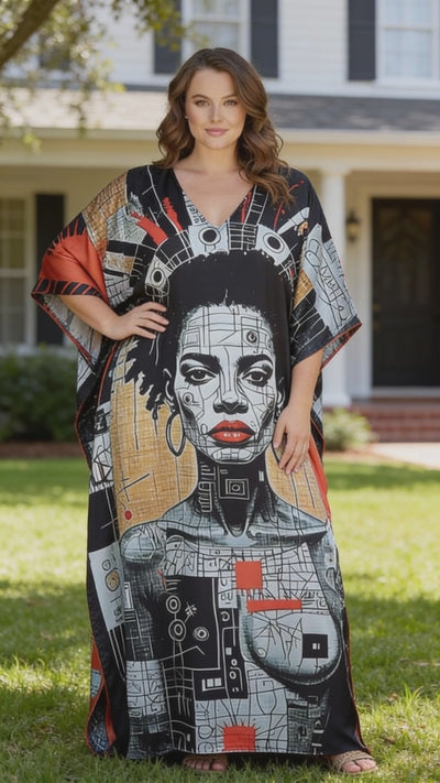 Black Artistic Face Satin Women Plus Size Kaftan Dress for Resort Evenings