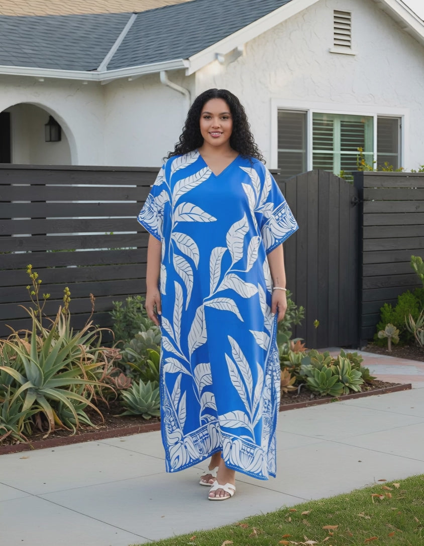 Blue Leaf Print Plus Size Kaftan Dress for Women Swimsuit Cover Up