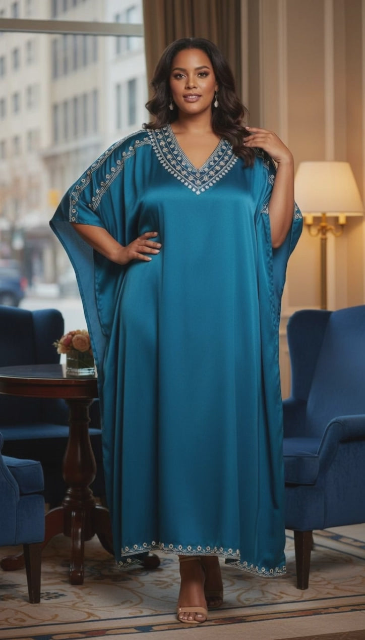 Embrace sophistication and style with our Corsair Blue satin katan, featuring intricate embroidery lace and tailored for plus size women. Discover your perfect fit in our range now.