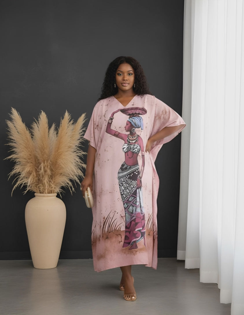 Dusty Pink Tribal Polyester Women Plus Size Caftan Dress