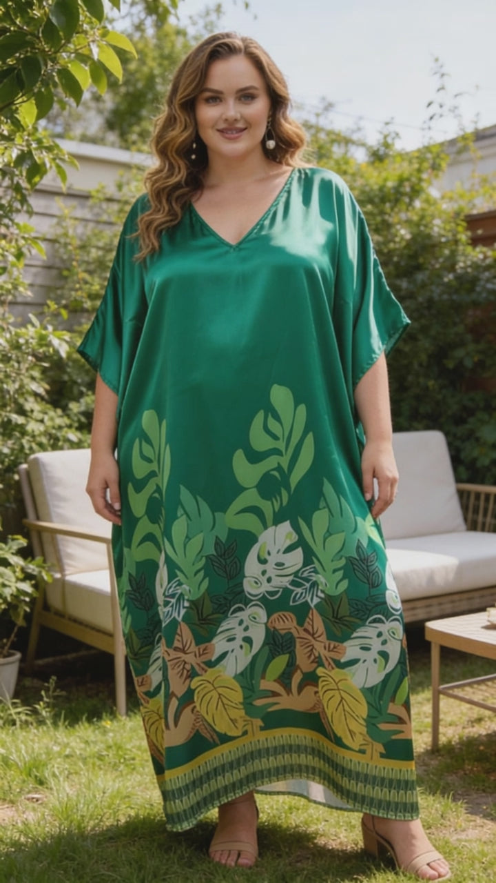 Emerald Green Leaf Satin Women Plus Size Kaftan Dress for Tropical Holidays